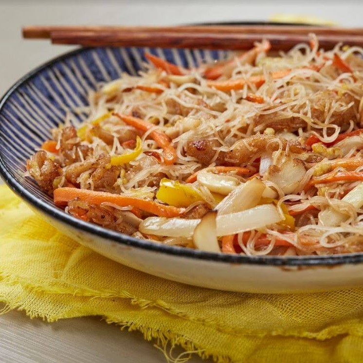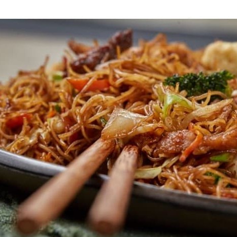 Macarrão de arroz, sem gluten e lactose, tiras de lombo suíno, flocos de ovos mexidos, pimentões, cebola, cenoura e champignon, salteados no tempero da casa.