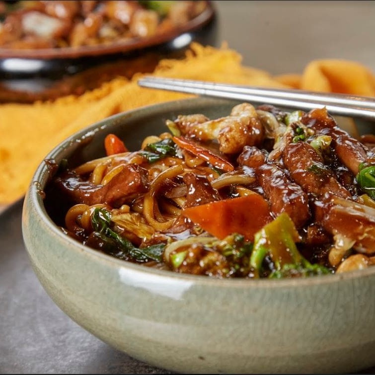 Delicioso Macarrão Chun-Li, Frito, tiras de Carne Bovina e cubos de Filé de Frango, Salteadas no Molho Chun-Li a base de Shoyu.