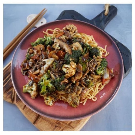 Delicioso macarrão chun-li, frito, legumes selecionados: brócolis, couve flor, cenoura, acelga e champingnon, salteadas no molho chun-li a base de shoyu.