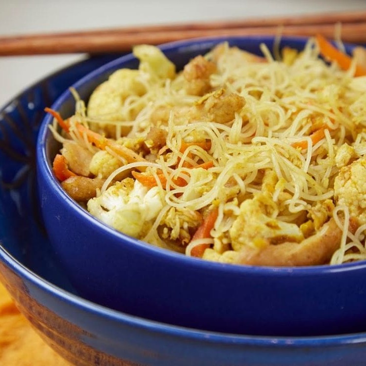 Sabor apimentado, tem suas origens na comida indiana, macarrão de arroz, livre de gluten e lactose, tiras de lombo suíno, flocos de ovos mexidos cenoura, cebola, champignon, envolvidos no tempero da casa.