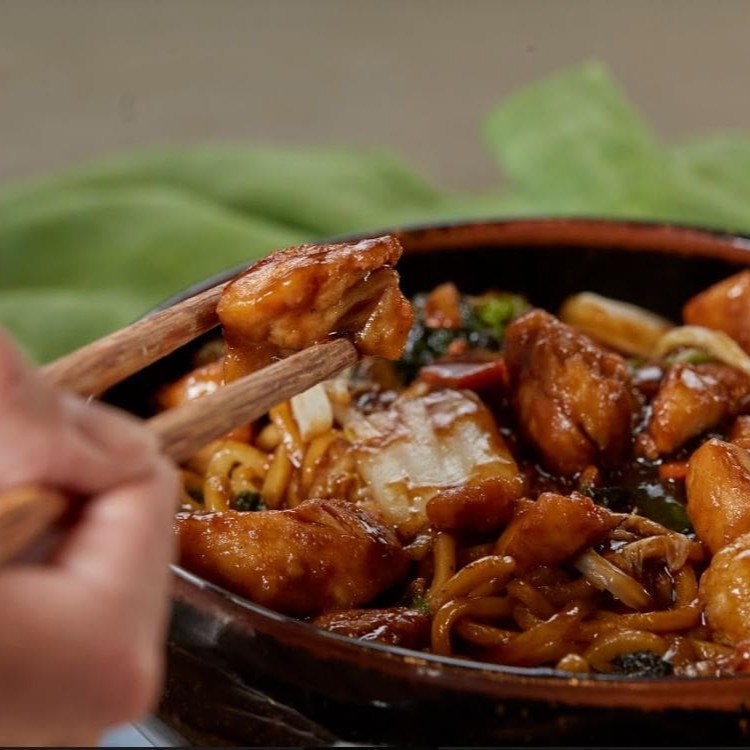 Delicioso macarrão chun-li, frito, cubos de filé de frango, legumes selecionados: brócolis, couve flor, cenoura e acelga, salteadas no molho chun-li a base de shoyu.