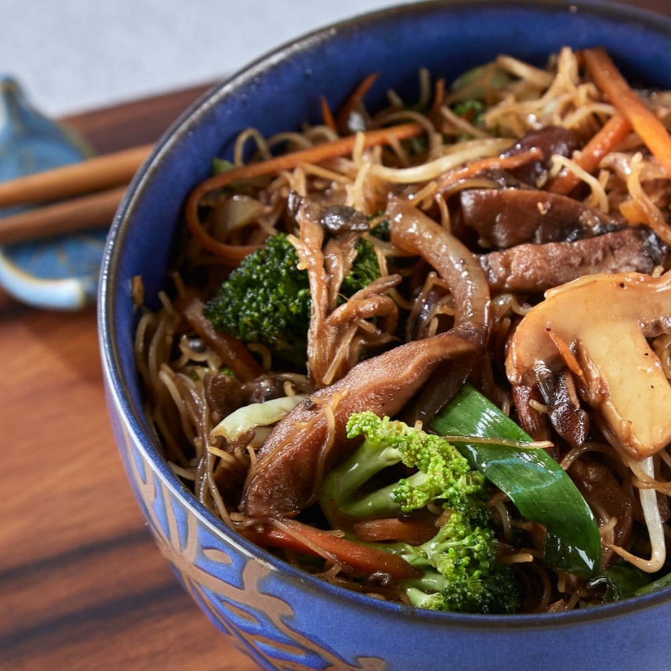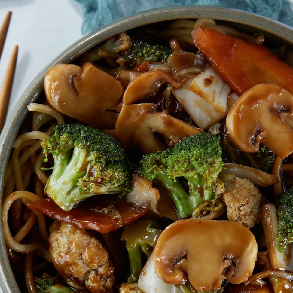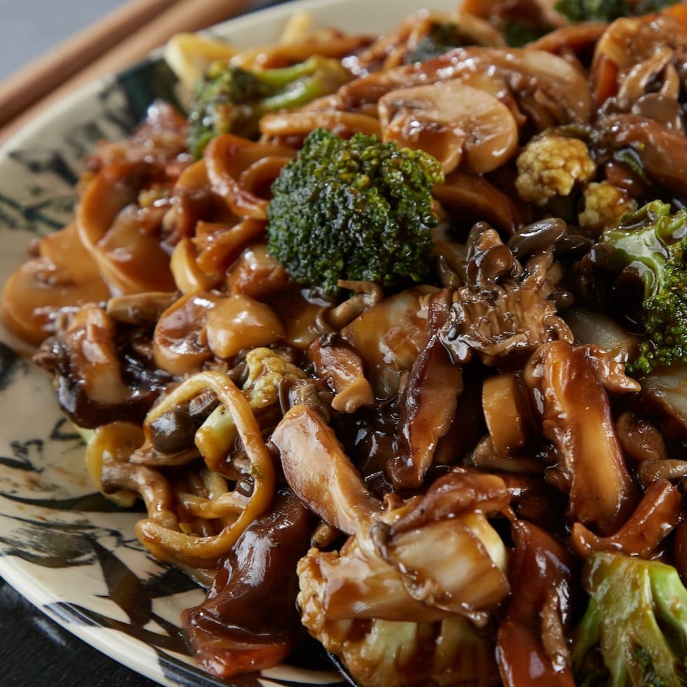 Mix de cogumelos selecionados: shimeji, shitake e champignon, com legumes ao dente: brócolis, couve flor, cenoura, acelga, envolvidos no molho Chun-Li e macarrão caseiro frito.