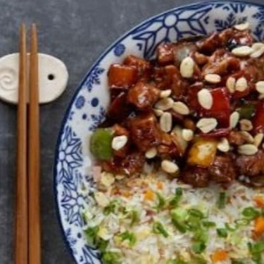 Uma ótima escolha a você que gosta de cubos de filé de frango. Com legumes selecionados: cebola, pimentão vermelho, amarelo, verde e amendoim. a porção executiva acompanha o yakimeshi (arroz da casa )