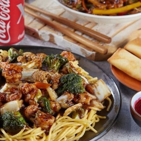 Delicioso macarrão chun-li, frito, cubos de filé de frango, legumes selecionados: brócolis, couve flor, cenoura e acelga, salteadas no molho chun-li a base de shoyu.