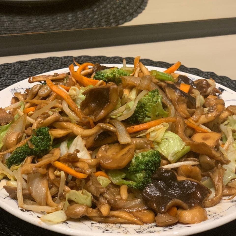 Uma mistura de Mix de cogumelos (shitake, shimeji e champignon), com Mix de legumes: cenoura, repolho, brocolis, moyashi e cebola, shoyo e tempero chun-li
