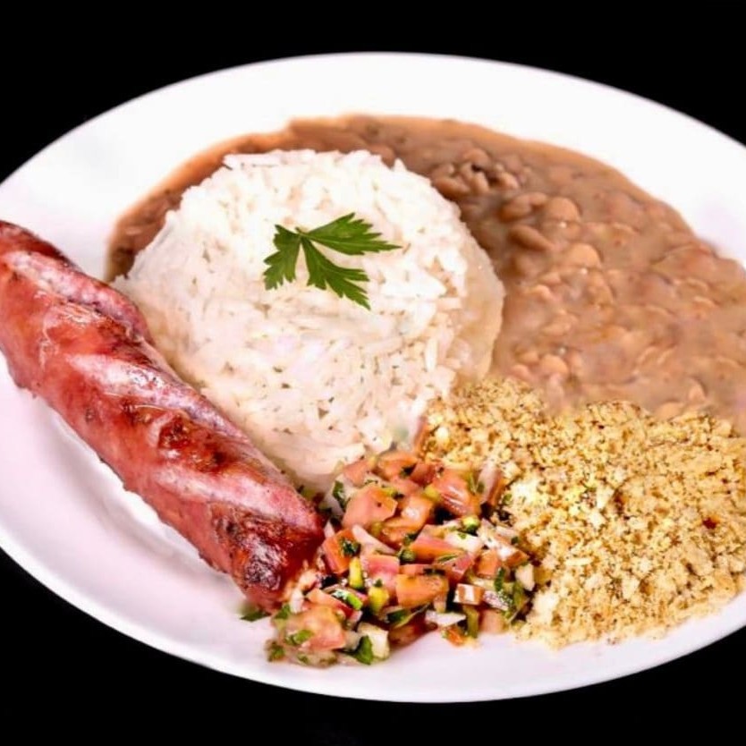 Arroz, feijão, farofa, vinagrete e 1 espetinho
