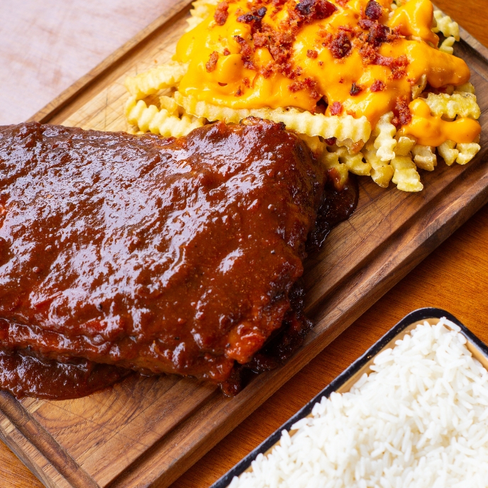 Costelinha barbecue, coberta com um molho barbecue caseiro. Acompanhada de arroz , e batatas fritas cobertas com uma camada de cheddar derretido e pedaços crocantes de bacon.