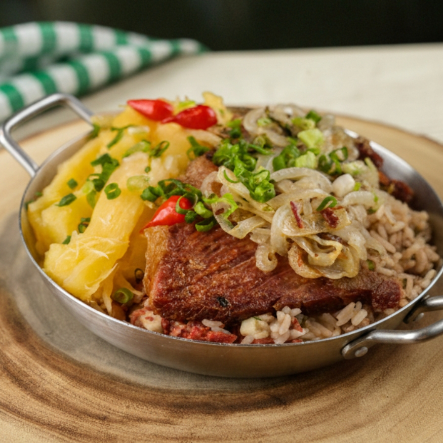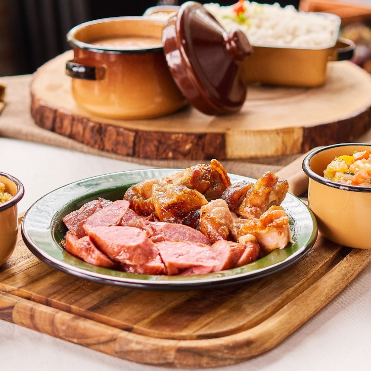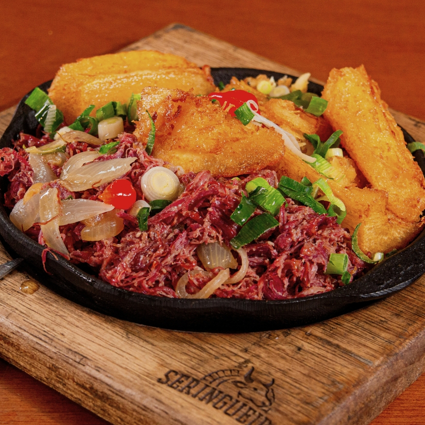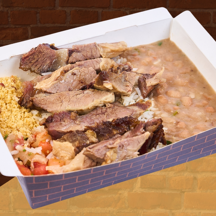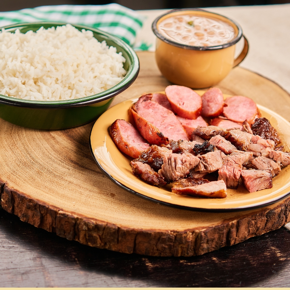 Arroz e feijão de corda, carne seca desfiada, calabresa e cubos de queijo coalho derretido, acompanhado por uma irresistível mandioca cremosa e Carne de Sol.