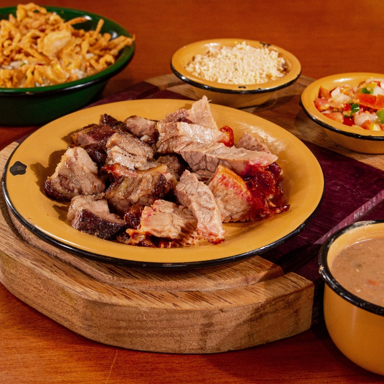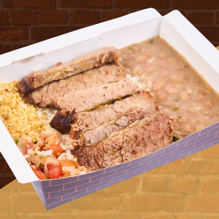 Costela Bovina (150g) assada na brasa por 7 horas, servida com arroz, feijão, vinagrete e farofa. *Não fazemos alterações*
