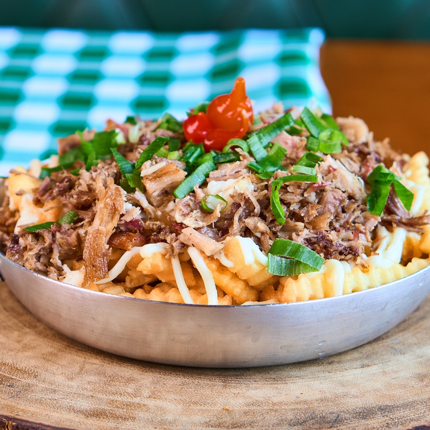 Batata crinckle coberta com costela desfiada e catupiry, finalizada com pimenta biquinho e cebolinha.