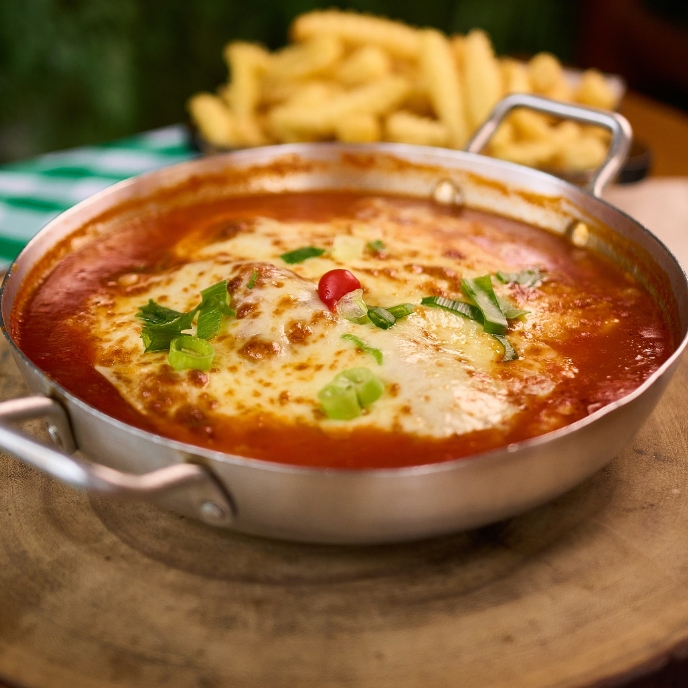 Parmegiana de Frango banhada em molho ao sugo da casa, com acompanhamentos incríveis para você escolher!