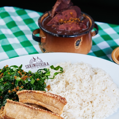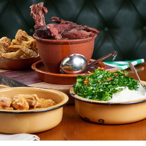 Feijoada completa é servida com paio, calabresa, carne seca, costelinha pé ou rabo, acompanha arroz, couve refogada, torresmo, molho de pimenta e farofa.