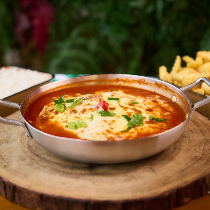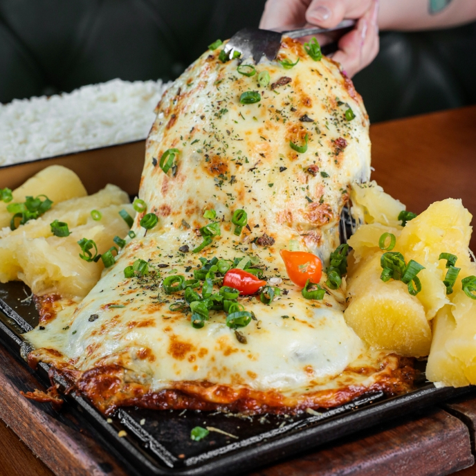 Cupim suculento com crosta crocante de queijo, servido com arroz fresquinho e mandioca cremosa. Um prato completo e delicioso para dividir!