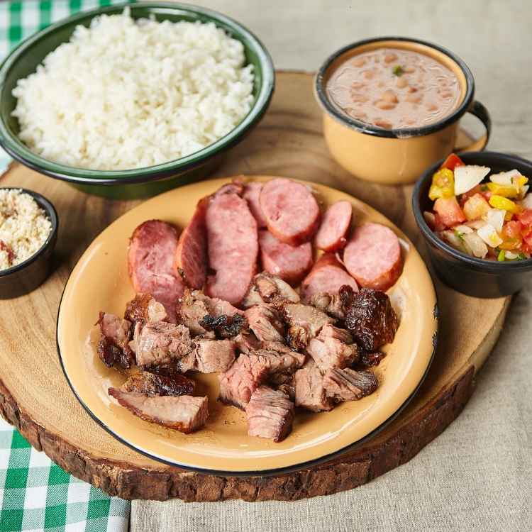 Fraldinha, frango e linguiça (450g), acompanhado de arroz, feijão, vinagrete e farofa.