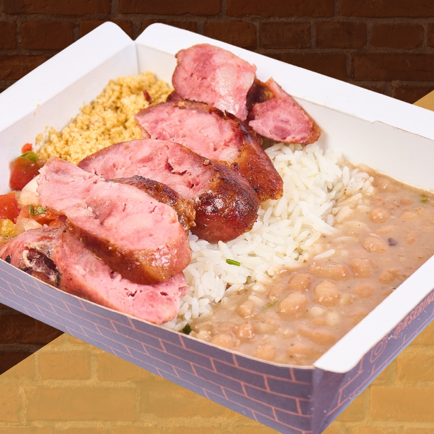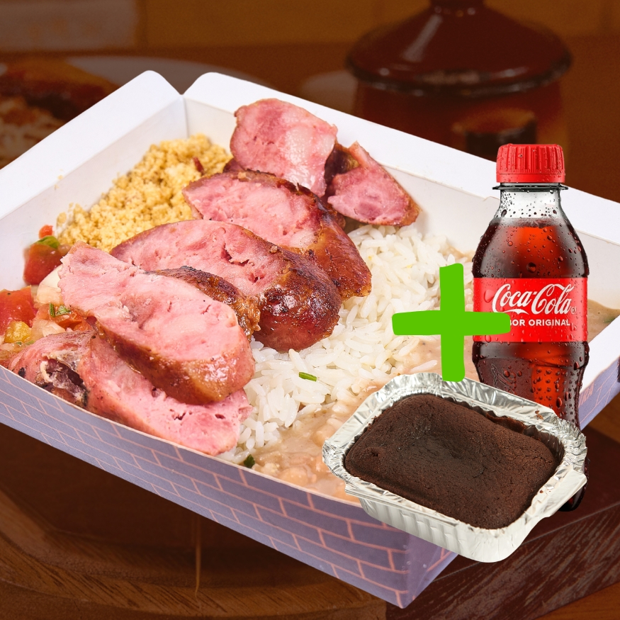 Linguiça assada na brasa, arroz, feijão, vinagrete e farofa + Bebida + Sobremesa