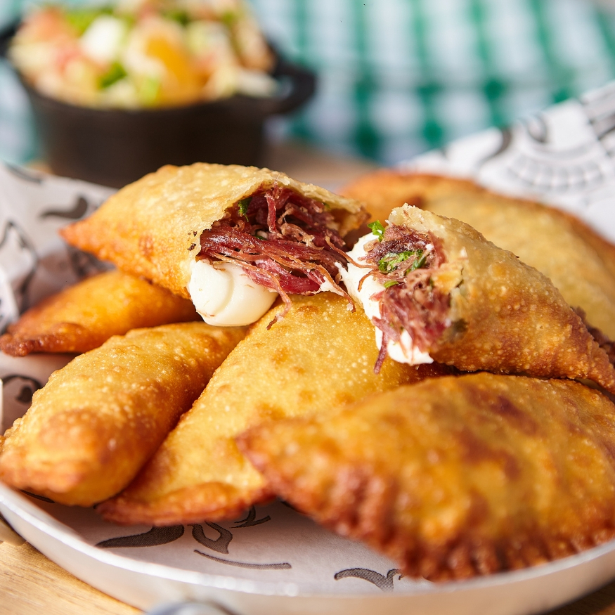 Pastéis de carne seca, requeijão cremoso e o sabor único do queijo coalho derretido.