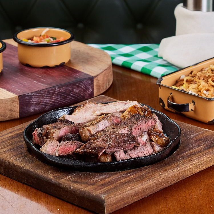 Escolha seus cortes favoritos (460 g no total) e um acompanhamento à sua escolha. Tudo servido separadamente.