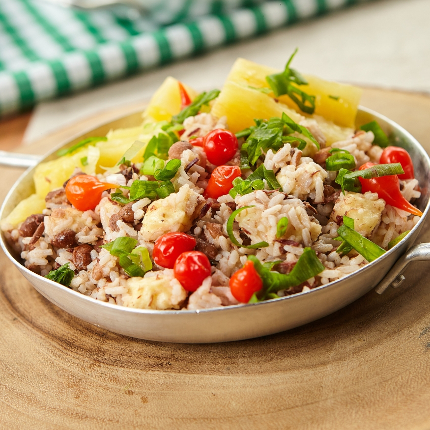 Baião de Dois preparado com arroz, feijão de corda, calabresa, carne seca desfiada, queijo coalho, servido com uma delciosa mandioca cozida