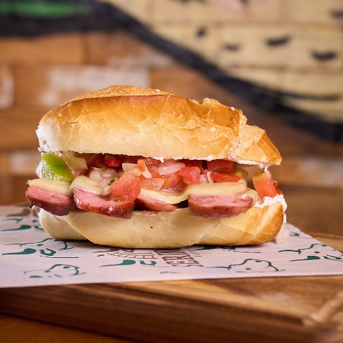 Nosso delicioso lanche com linguiça assada na brasa, uma deliciosa maionese de chimichurri, queijo e vinagrete fresquinho, tudo isso no pão de sal.