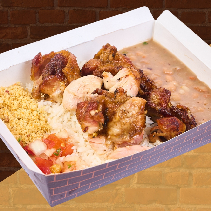 Coxa sobrecoxa (150g) assada na brasa, acompanhada de arroz, feijão, vinagrete e farofa. *Não fazemos alterações*