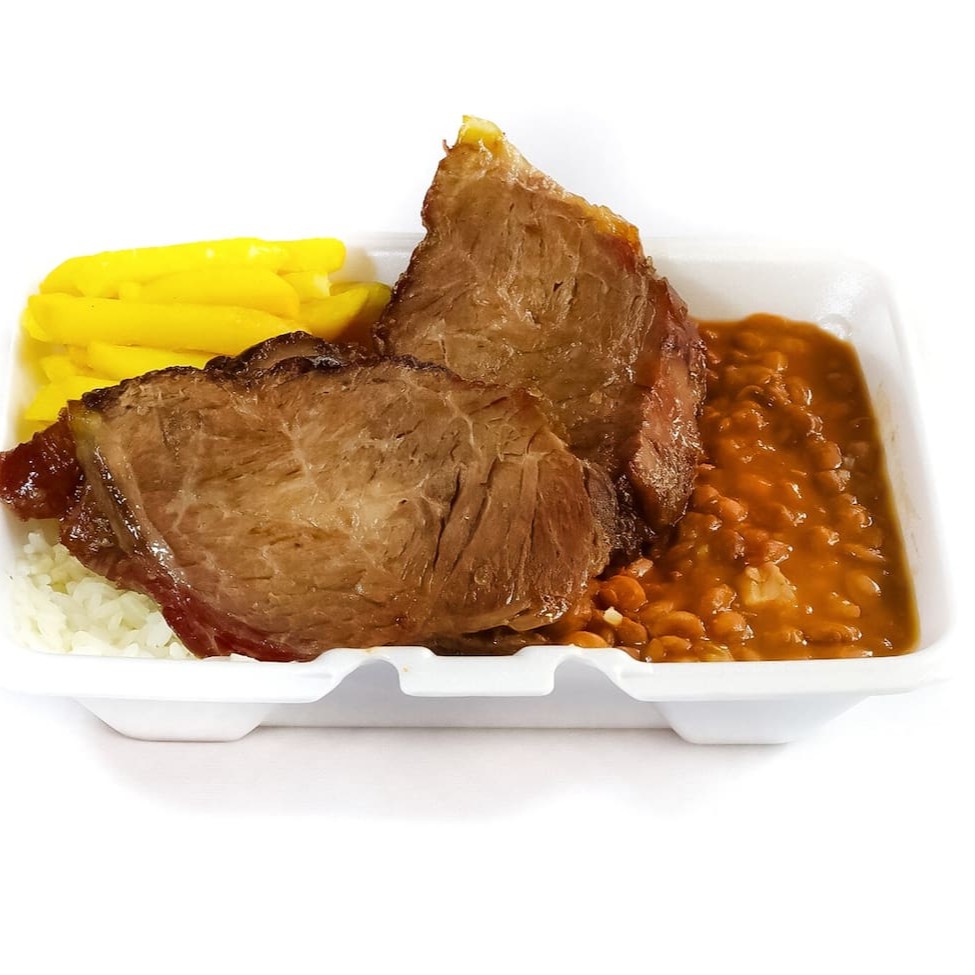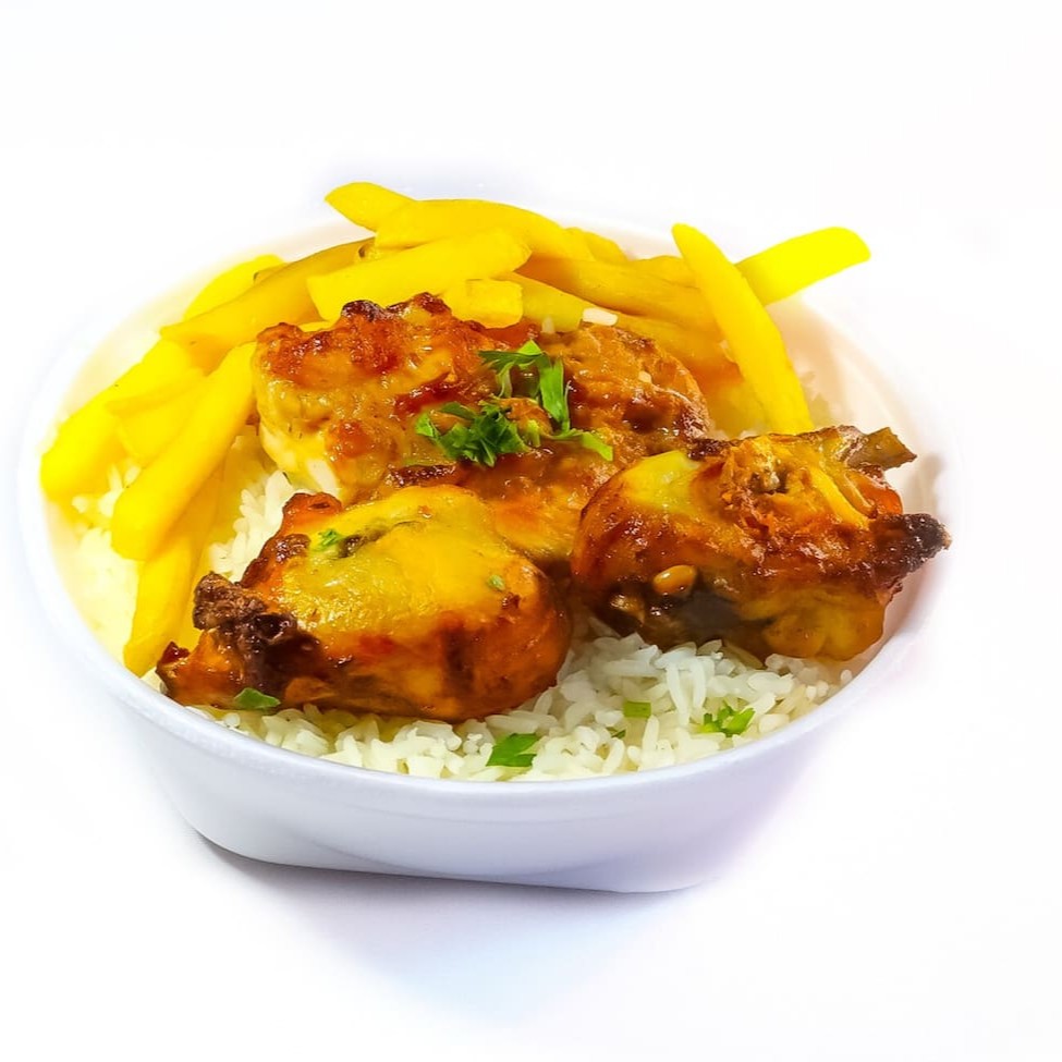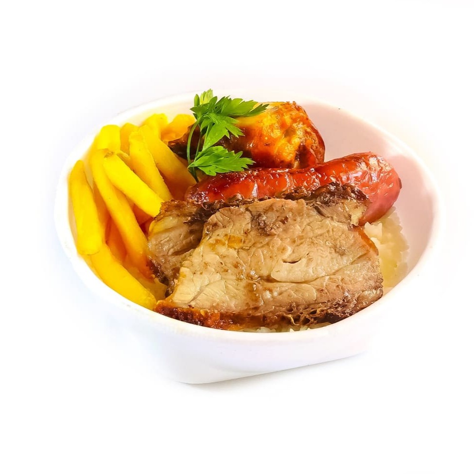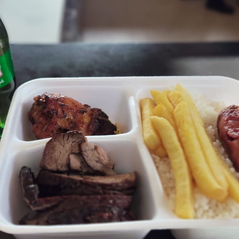 Marmita acompanha arroz, feijão, fritas, carne, linguiça e frango + Refrigerante de 200ml
