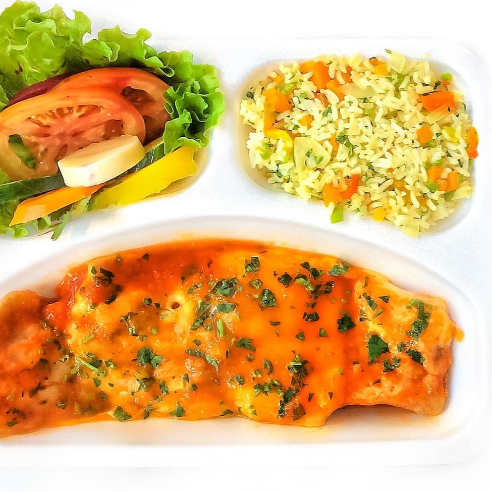 O 'Executivo à Parmegiana de Peixe' é uma refinada opção da nossa linha de 'Pratos Executivos'. Apresenta um peixe meticulosamente escolhido, banhado na mais perfeita camada de queijo parmesão derretido, proporcionando um sabor único e inesquecível. É servido com o nosso sofisticado arroz à grega, carregado de sabores exuberantes e nuances variadas. Acompanha também uma salada fresca e crocante, garantindo um equilíbrio perfeito para o prato. Uma refeição verdadeiramente agradável para os amantes da boa gastronomia.