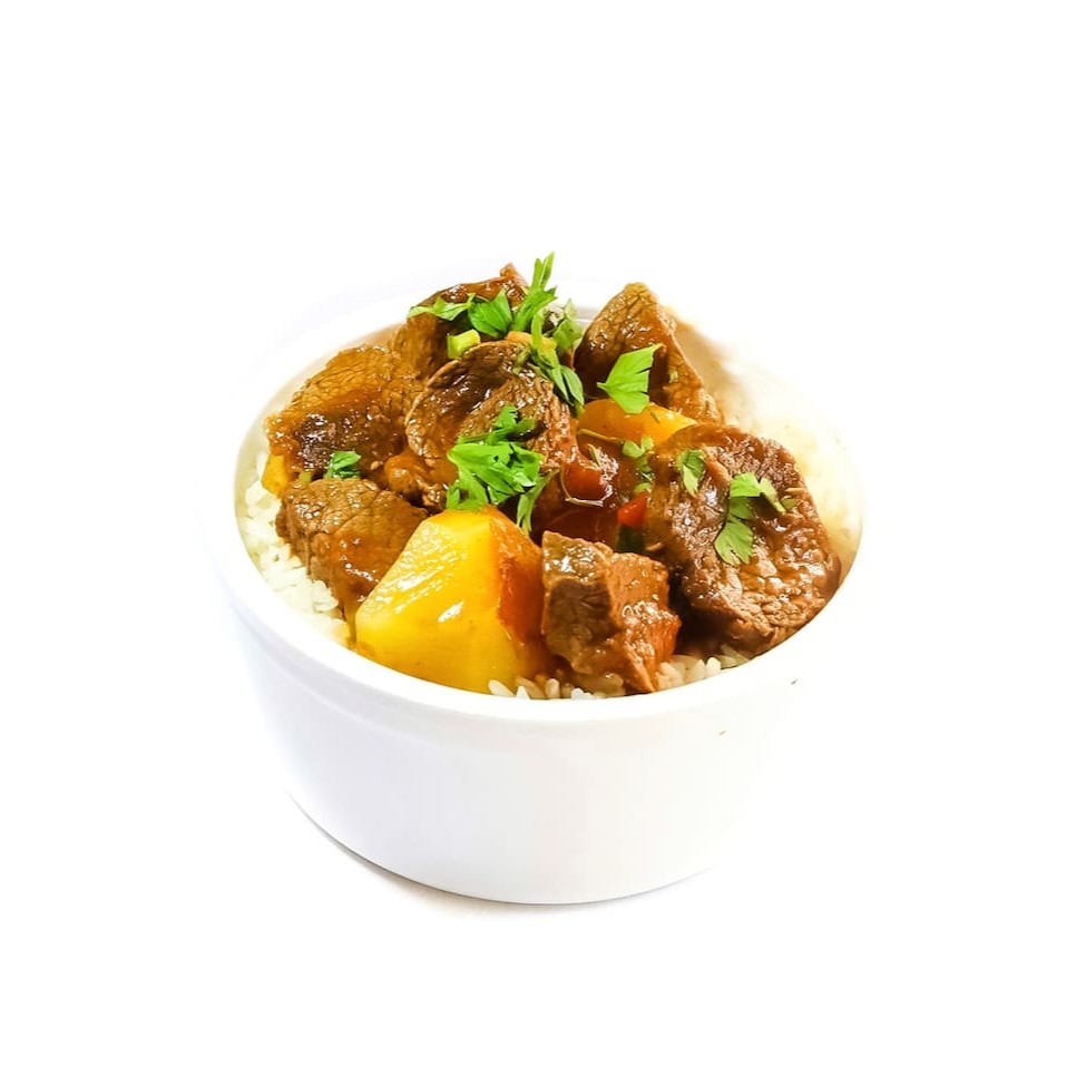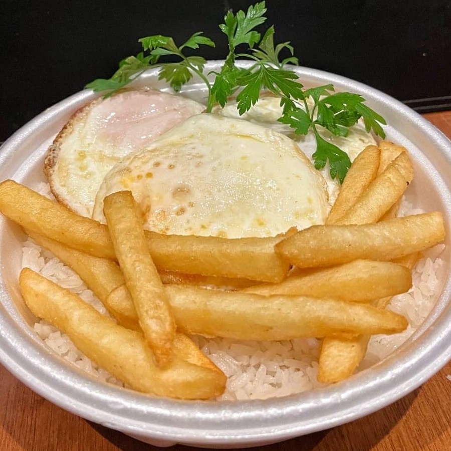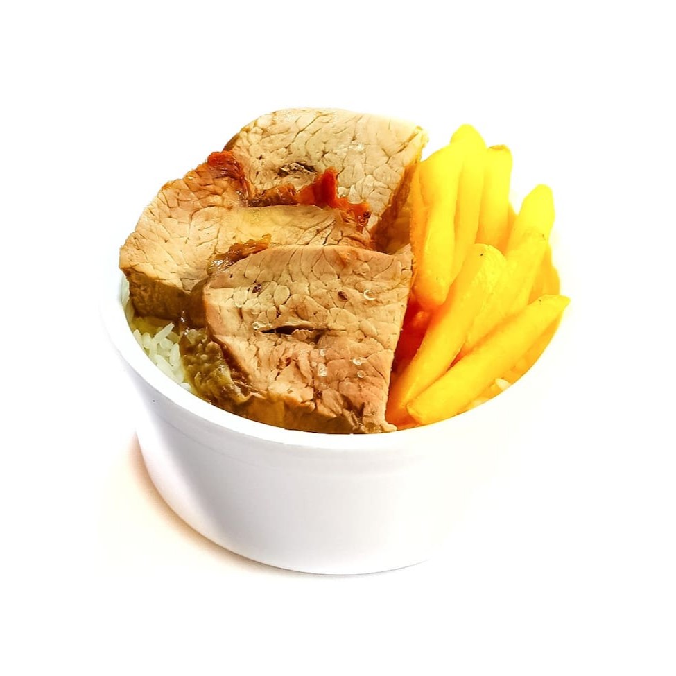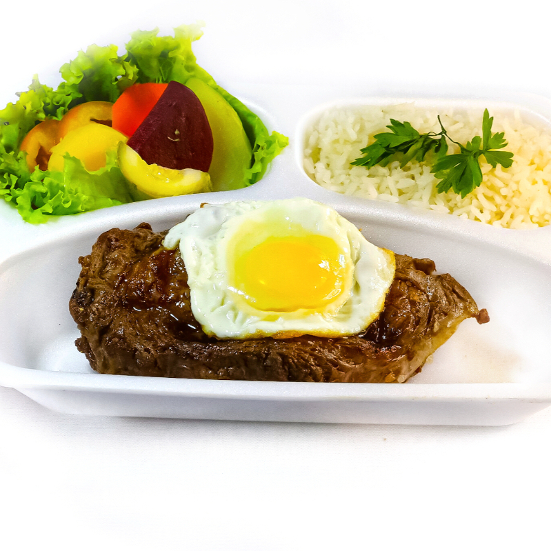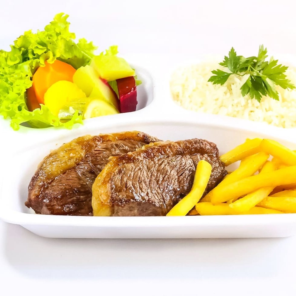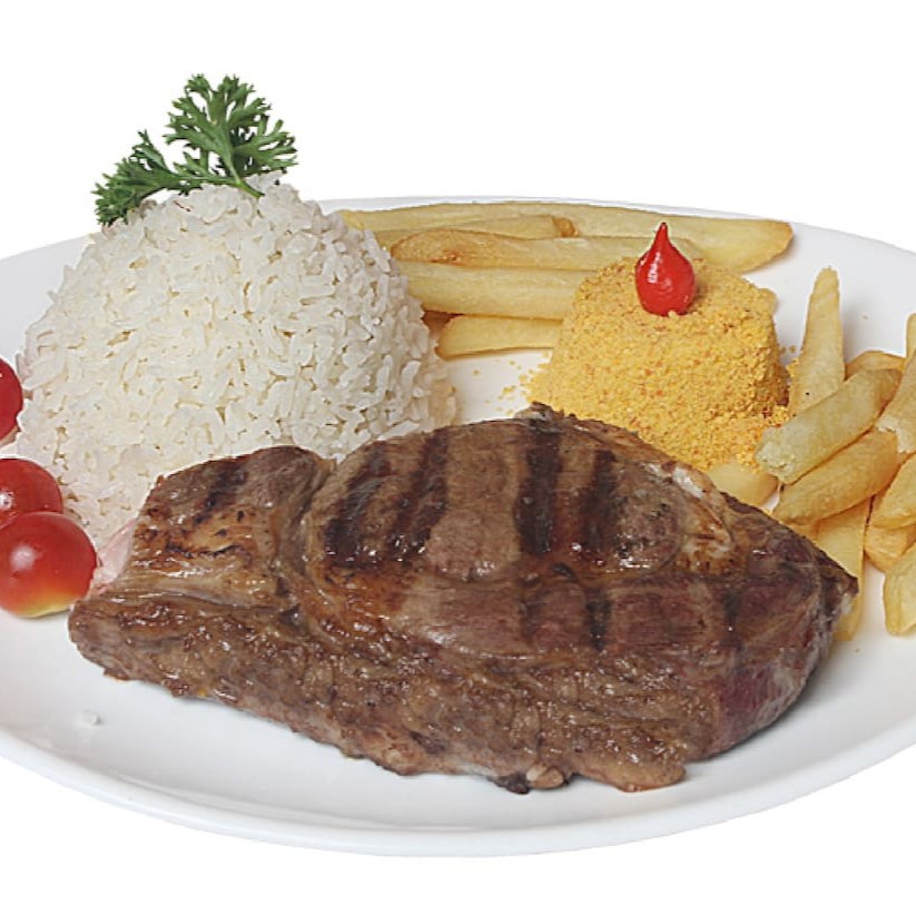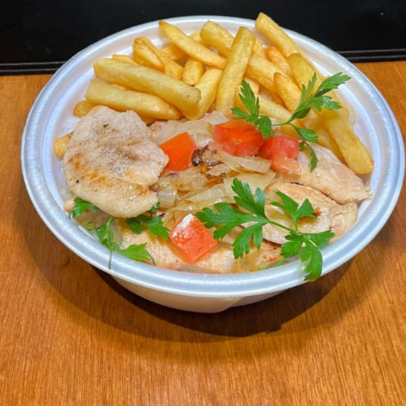 Filé de Carne cortado em tiras com cebola, acompanha arroz, feijão e batata frita.
