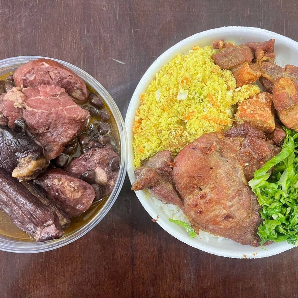 Feijoada( carne seca, linguiça, costelinha),arroz, couve, torresmo , farofa e bisteca