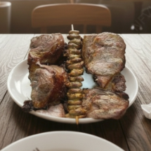 Carne (maminha, fraldinha, contra filé, picanha, alcatra , bife ancho) e coração.