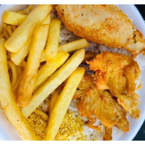 Arroz, feijão, macarrão e farofa. File de frango com fritas