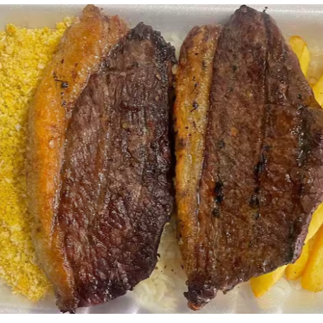 Bife acebolado, arroz, feijão, macarrão, farofa.