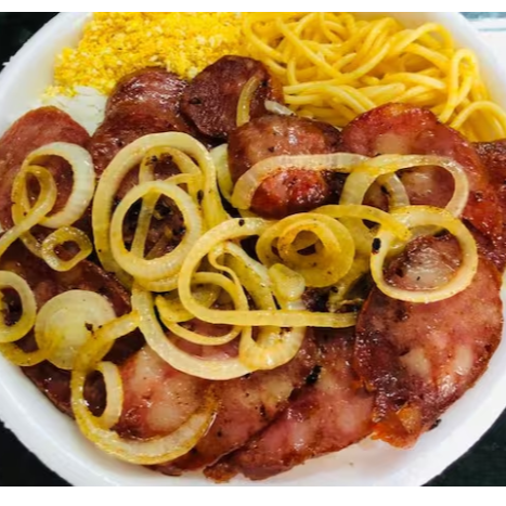 Arroz, feijão, macarrão, farofa. Calabresa acebolada.