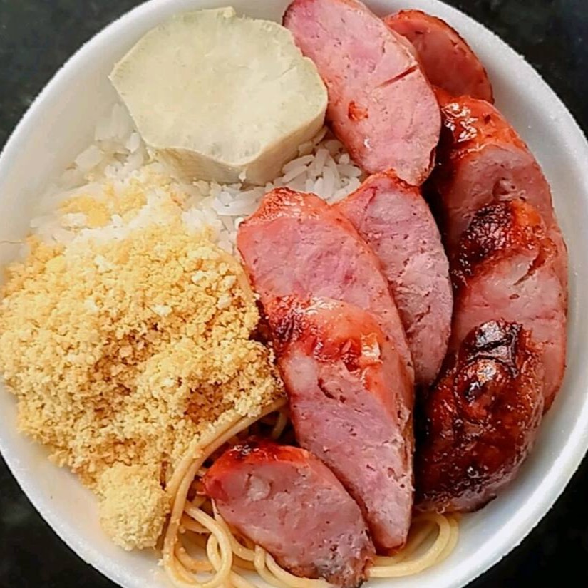 Acompanha arroz, feijão, macarrão, farofa e uma deliciosa linguiça toscana.