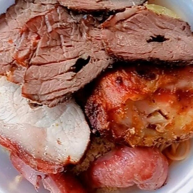 Acompanha arroz, feijão, macarrão, farofa, fraldinha, frango e linguiça.