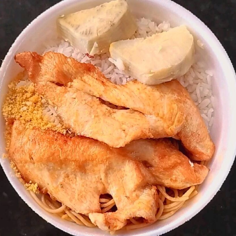 Acompanha arroz, feijão macarrão ,farofa e um delicioso filé de frango