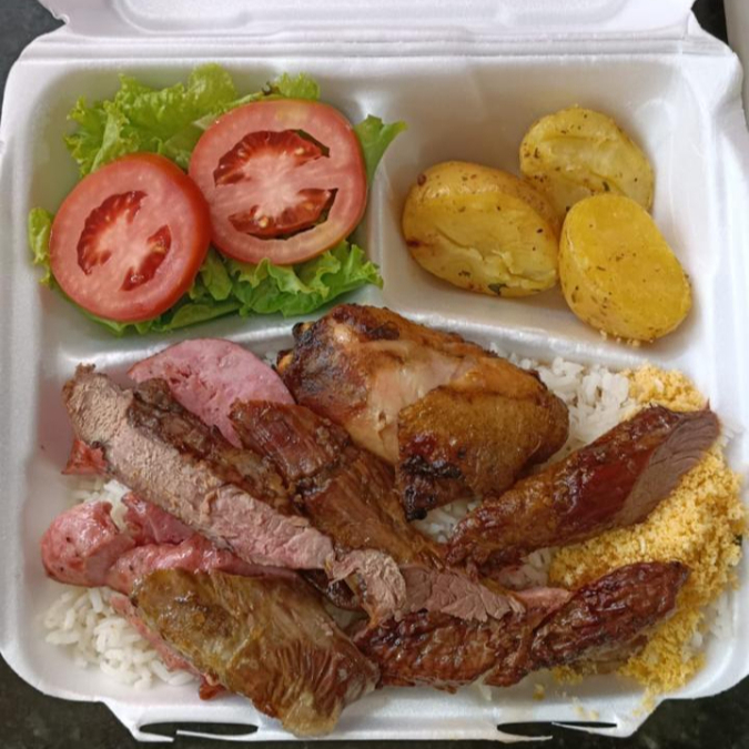 Acompanha arroz, feijão, macarrão, farofa, fraldinha frango e linguiça.