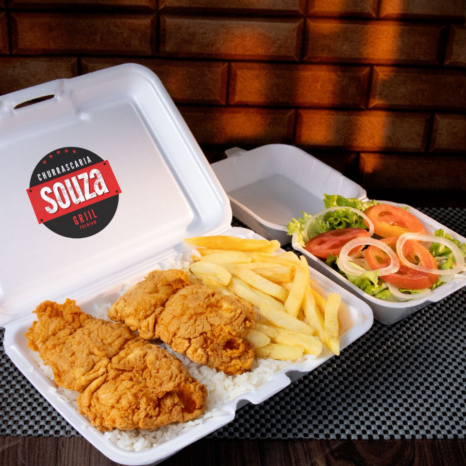 Uma deliciosa marmitex acompanhada de arroz branco soltinho, feijão bem fresquinho e batata frita sequinha e crocante.