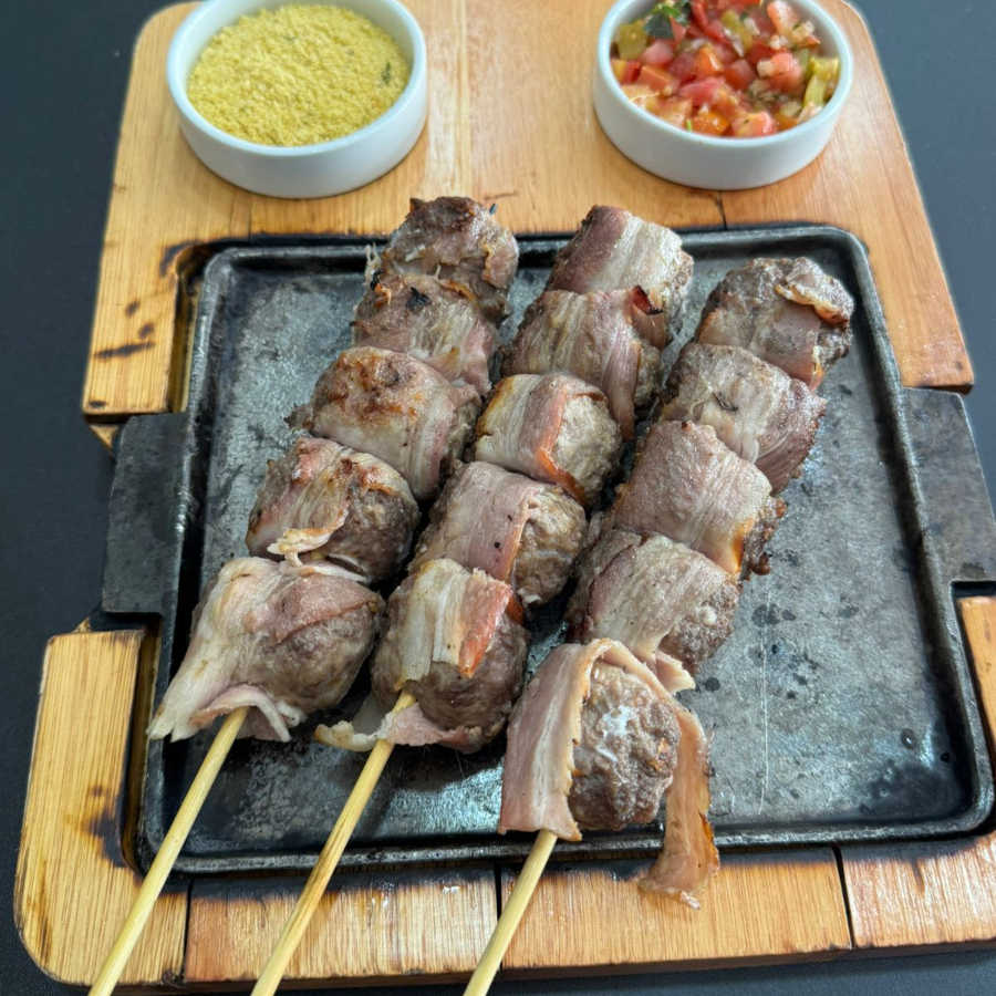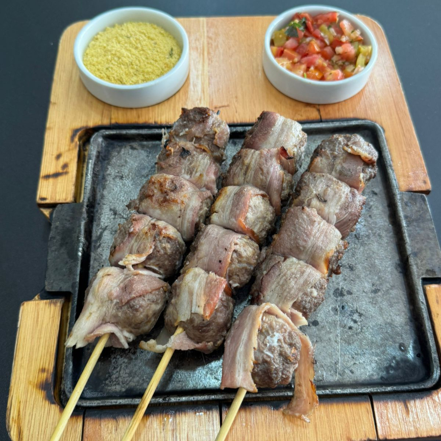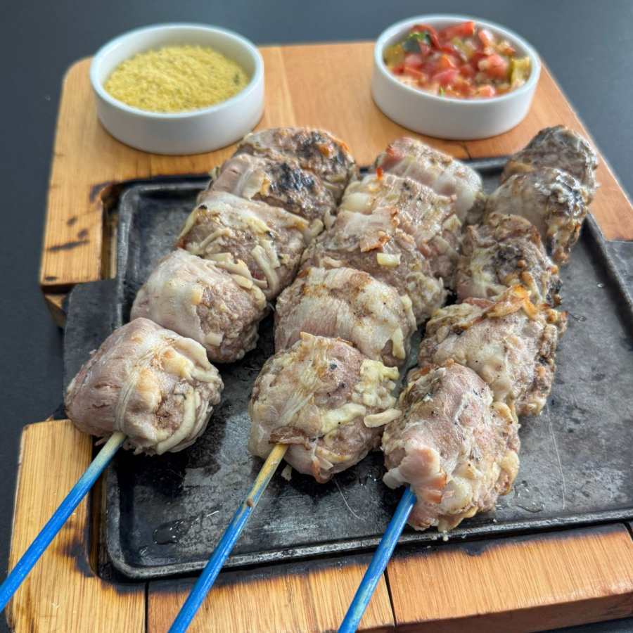 7 espetos 2 carne 2 kafta 1 coração 1 Linguiça ,1 pão de alho,acompalha Arroz Branco Batata em conserva e vinagrete
