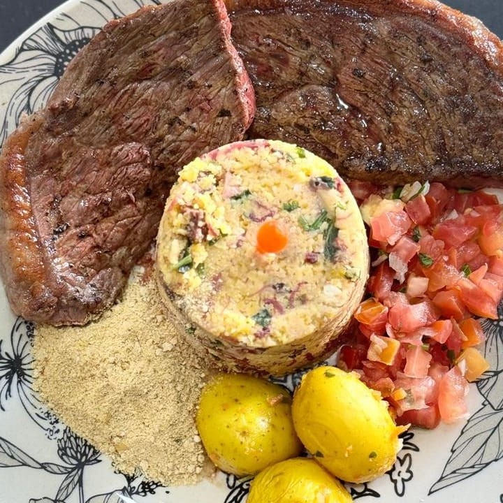 Neste prato Trazemos o queridinho dos nossos clientes o famoso cuscuz do churrasco do ju feita na qualiadade nordestina com aquele toque da carne seca junto com cabresa e bacon que da um sabor unico do churrasco do ju mais aquele vinagrete fresco e não podia faltar aquela batata em conserva 2 bife de picanha mais aquele farofa da casa