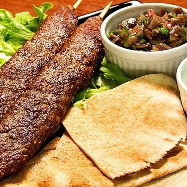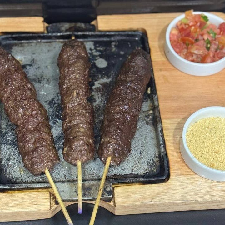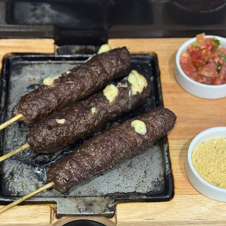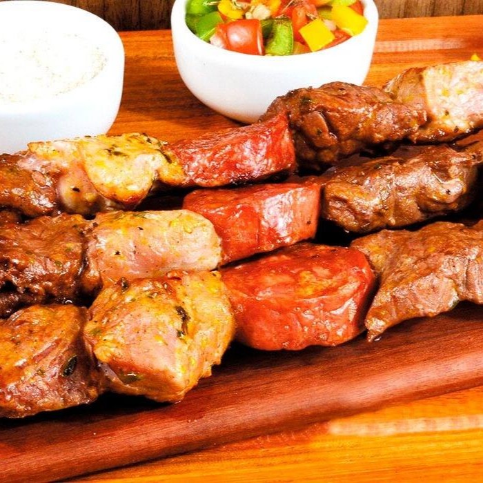 7 espetos 2 carne 2 kafta 1 coração 1 Linguiça ,1 pão de alho,acompalha Arroz Branco Batata em conserva e vinagrete