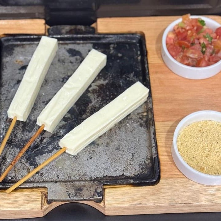 5 pedacos de Picanha com queijo coalho de baião de 2 vinagrete batata em conserva e farofa