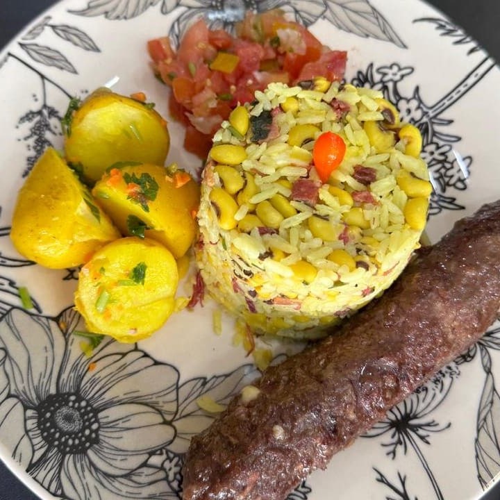 Um delicioso baioão de 2 feito na casa com um vinagrete fresco feito diariamente ,acompanha uma deliciosa porção de batata em conserva + 1 espeto da sua escolha