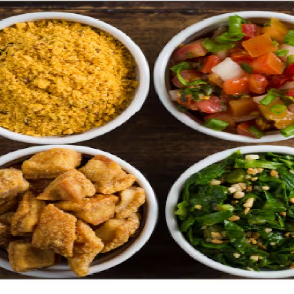 Vinagrete, farofa e molho de alho