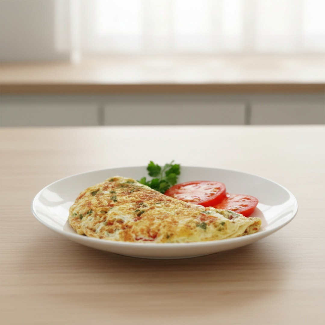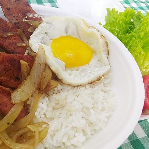 Panqueca de calabresa, cebola, ovo, pimenta, arroz, feijao batata, salada