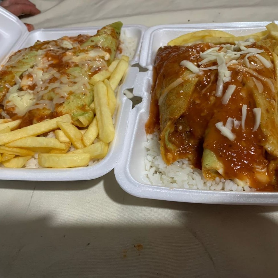 Panqueca de carne moida ao molho,arroz,feijao,batata frita e salada promoçao hoje