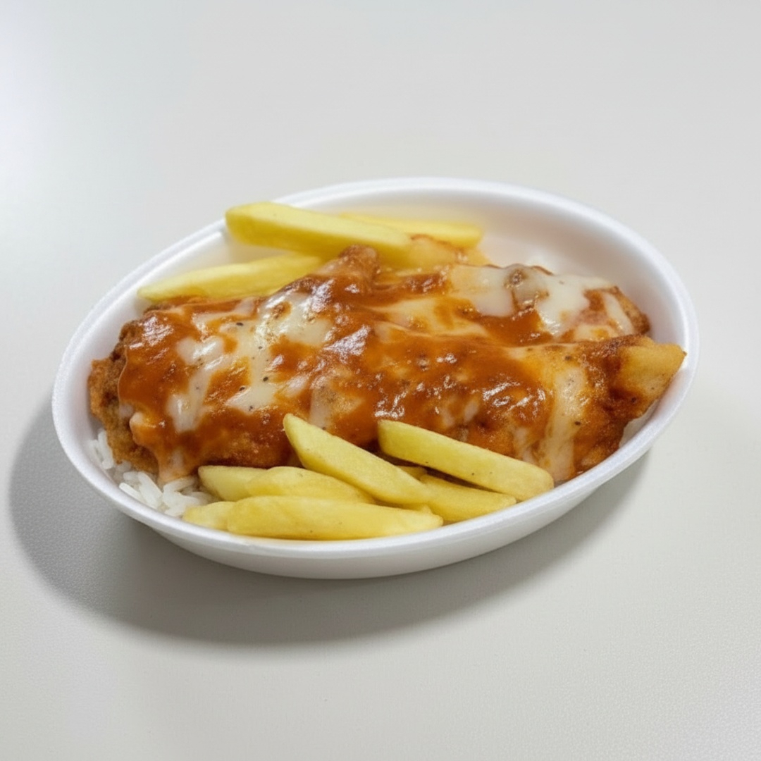 Panqueca de calabresa com queijo, arroz, feijão, batata
