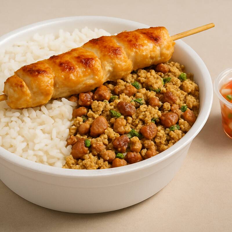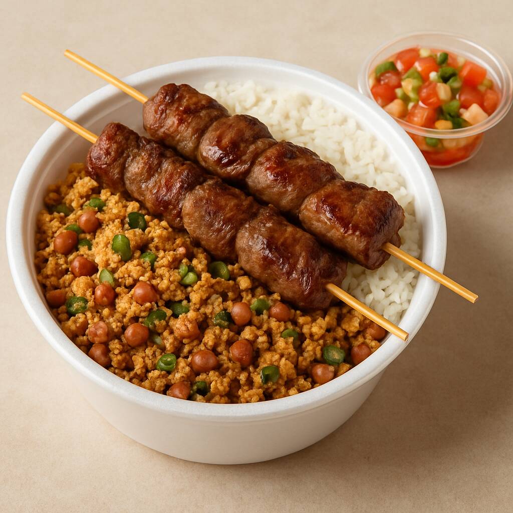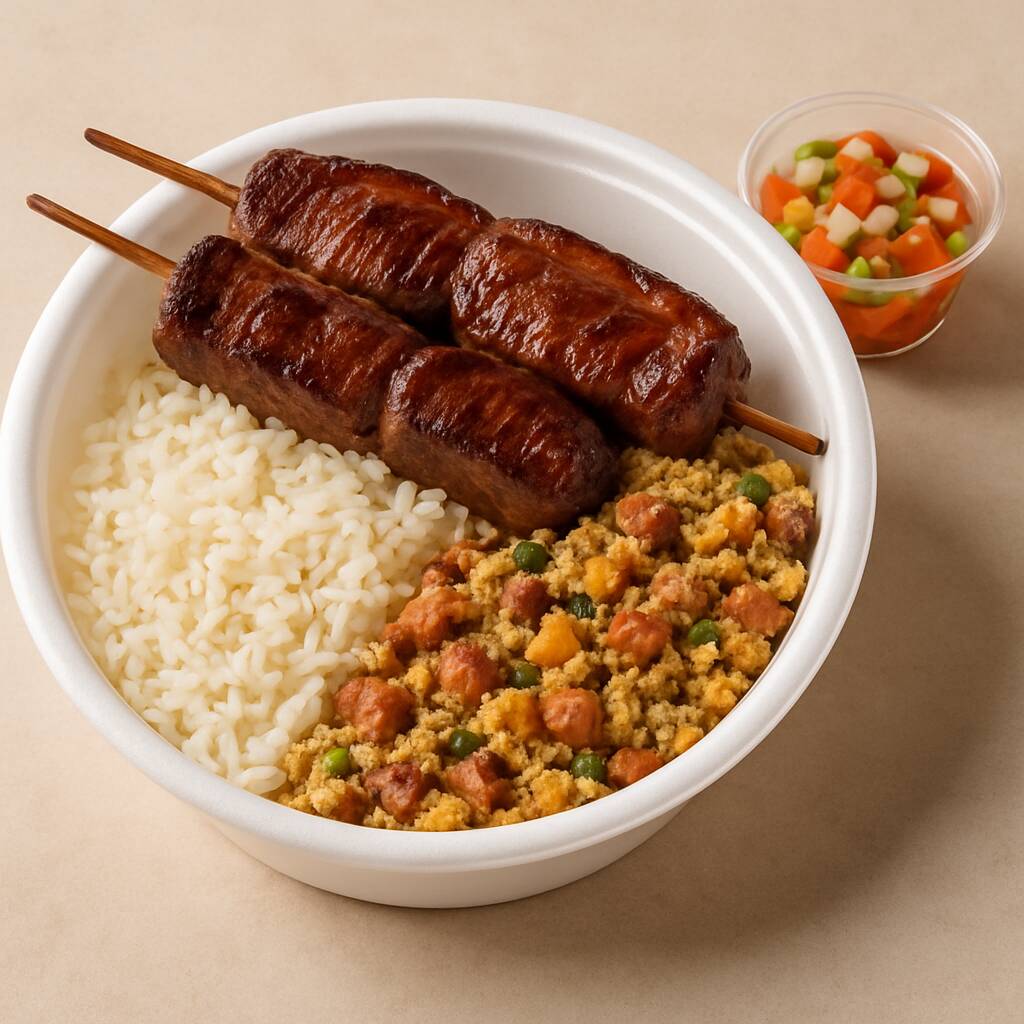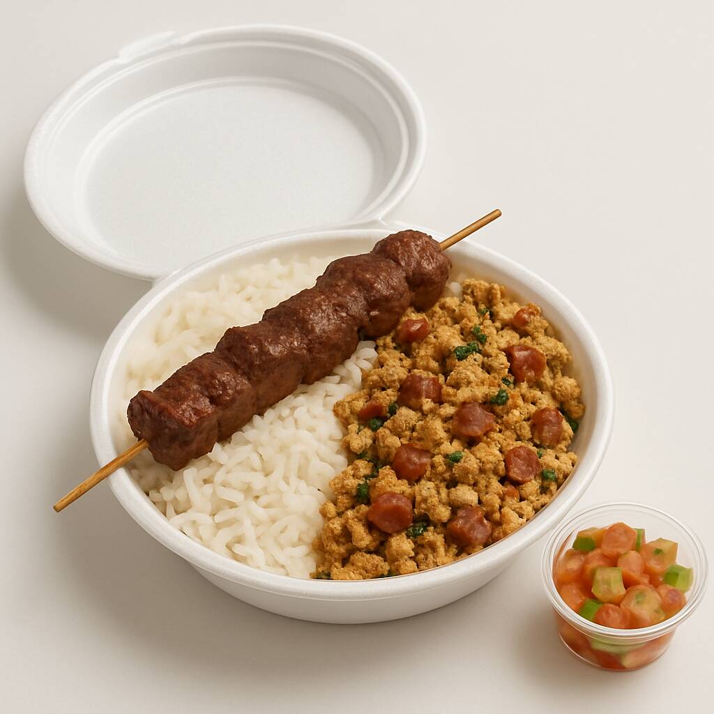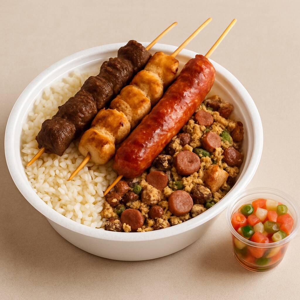 Aproveite nosso espeto de Frango, Alcatra e Linguiça , acompanhados de arroz soltinho, feijão tropeiro e vinagrete fresco. Aproveite essa oferta irresistível! Marmita de 750g (300g Espeto, 250g Arroz, 150g de feijão tropeiro e 50g Vinagrete).