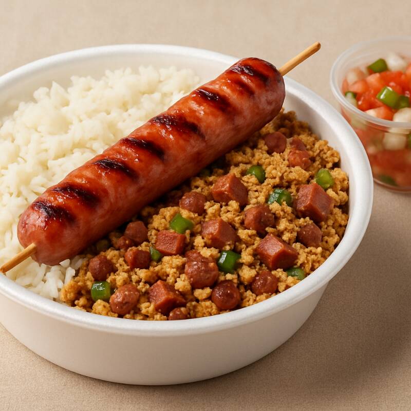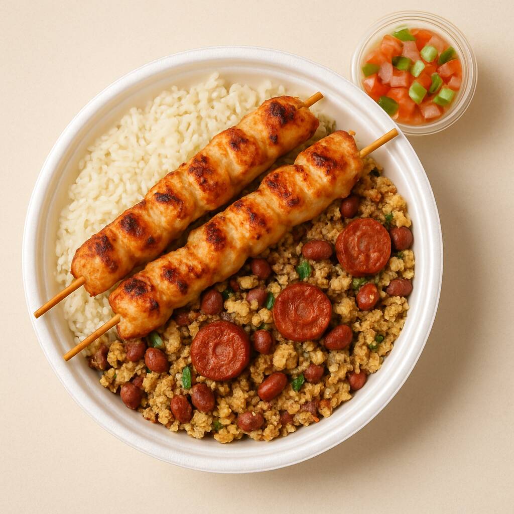 Aproveite nosso espeto de Linguiça , acompanhados de arroz soltinho, feijão tropeiro e vinagrete fresco. Aproveite essa oferta irresistível! Marmita de 550g (100g Espeto, 250g Arroz, 150g de feijão tropeiro e 50g Vinagrete).