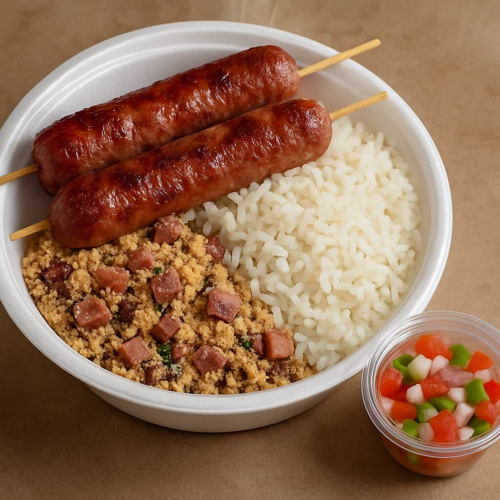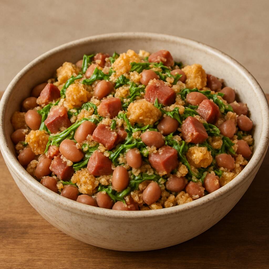 Receita tradicional mineira preparada com feijão, bacon, linguiça, ovos e farinha de mandioca, tudo refogado com temperos frescos. Uma porção de 200g cheia de sabor, perfeita para acompanhar carnes, arroz ou servir como prato principal. Experimente esta combinação irresistível de aromas e texturas, típica da culinária brasileira.