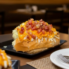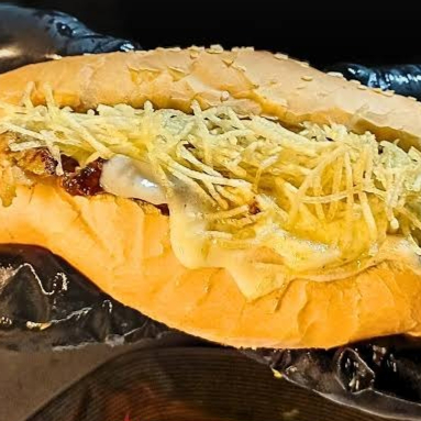 Surpreenda-se com esse delicioso sabor de linguiça toscana grelhada e fatiada, catupiry, bacon e cheddar na baguete de parmesão, acompanha molho da casa e vinagrete.
